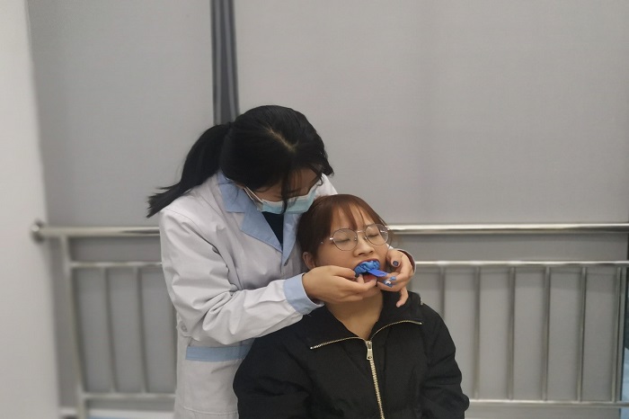 本次活动主要针对晚上有夜磨牙症状的学生,通过制取印模、修整模型、压塑模型、打磨抛光和口内试戴等操作师生共同为学生制作颌垫,解决晚上夜磨牙问题,从而达到改善口腔状况,提高睡眠质量的效果。为了使学生在佩戴和摘取时获得更好的体验感和舒适性,陈梦雨和贺蒙帆耐心细致讲解注意事项,对个别佩戴不适的学生一一进行调改和指导。