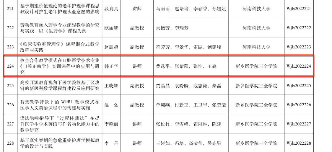 近日,河南省卫健委下发《关于公布2022年河南省医学教育研究项目立项教学成果和优质课评选结果的通知》,我院韩正华老师主持的《“校企合作教学模式在口腔医学技术专业《口腔正畸学》实训课程中的应用与研...