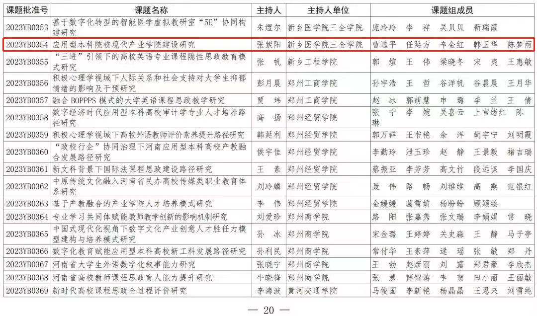 近日,河南省教育厅下发《关于公布河南省教育科学规划2023年度一般课题立项名单的通知》(教教科〔2023〕182号),我院副院长张紫阳申报的“应用型本科院校现代产业学院建设研究”项目成功获批,这是我院...