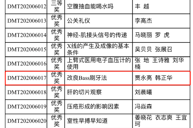 新乡医学院三全学院第十一届教育教学信息化大赛按照预定方案和规定程序,经各教学单位选拔推荐、专家评审、院务会审定,共评选出各类奖项62项,其中口腔技术学院贾永亮老师的作品《改良Bass刷牙法》荣获教...